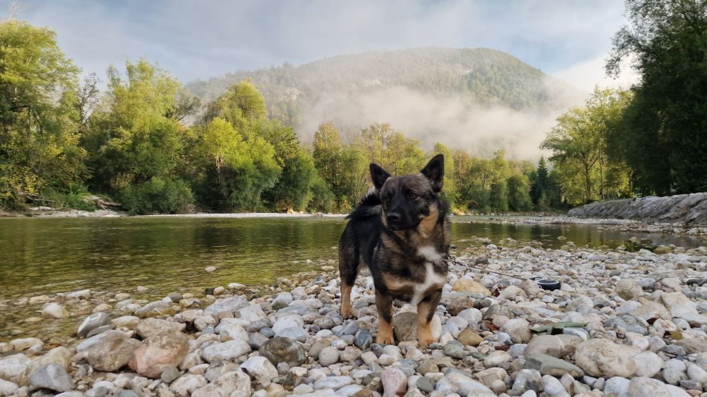 Björn har lite koll på en hund som också var ute och beskådade morgondimman.