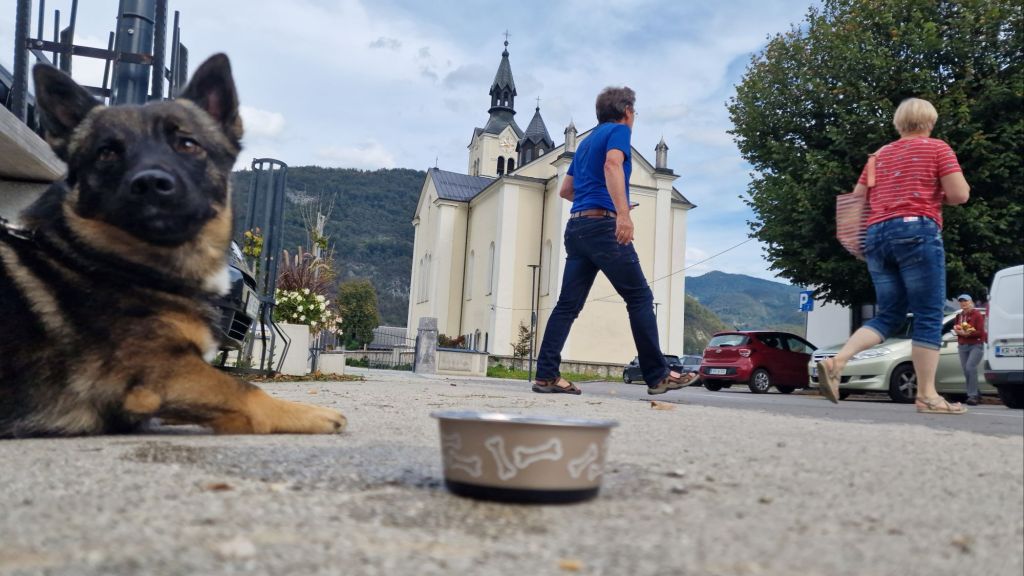 När husse handlar mat på Spar passar Björn på att dricka sitt medhavda vatten.