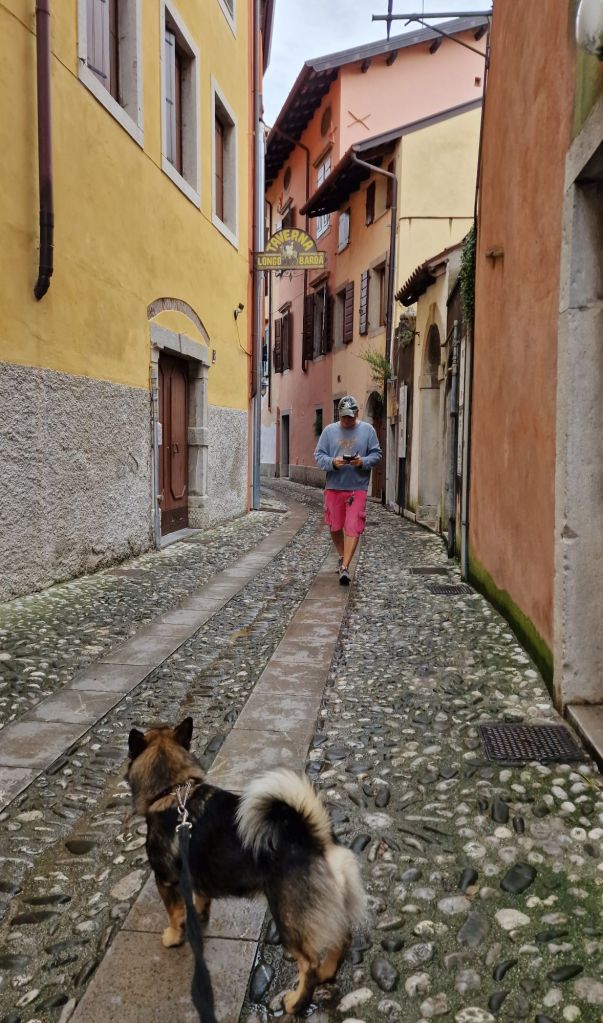 Björn lägger sig tillrätta och spanar. Ibland vaktar han lite men mest spanar han på hundar. I Italien har de koppel, hittills.