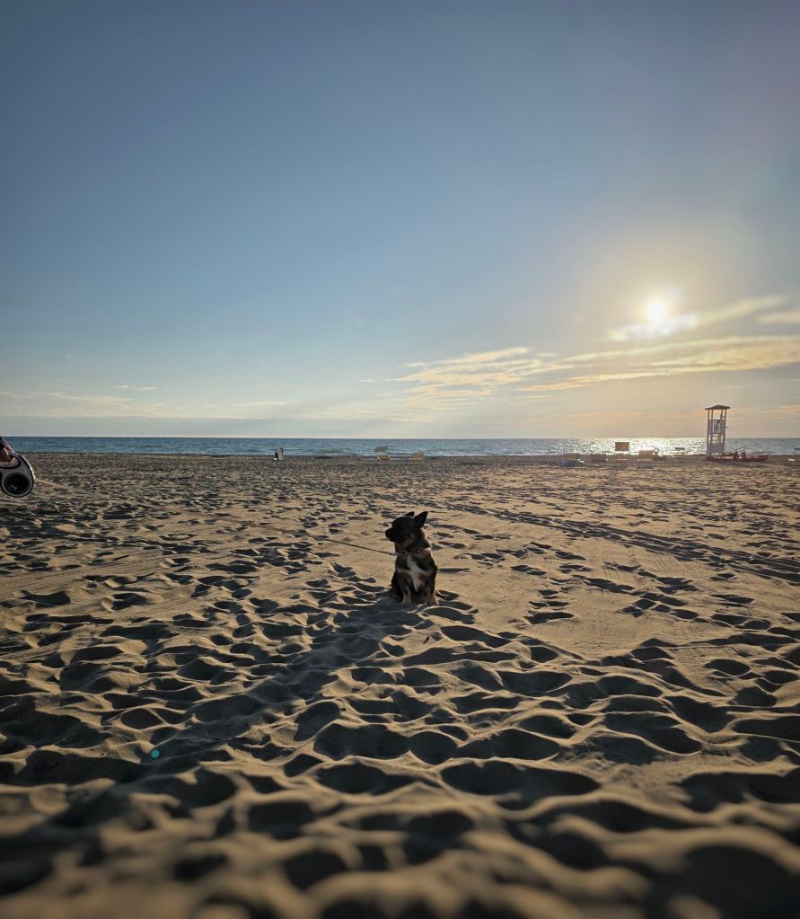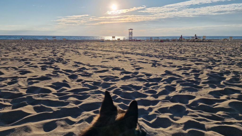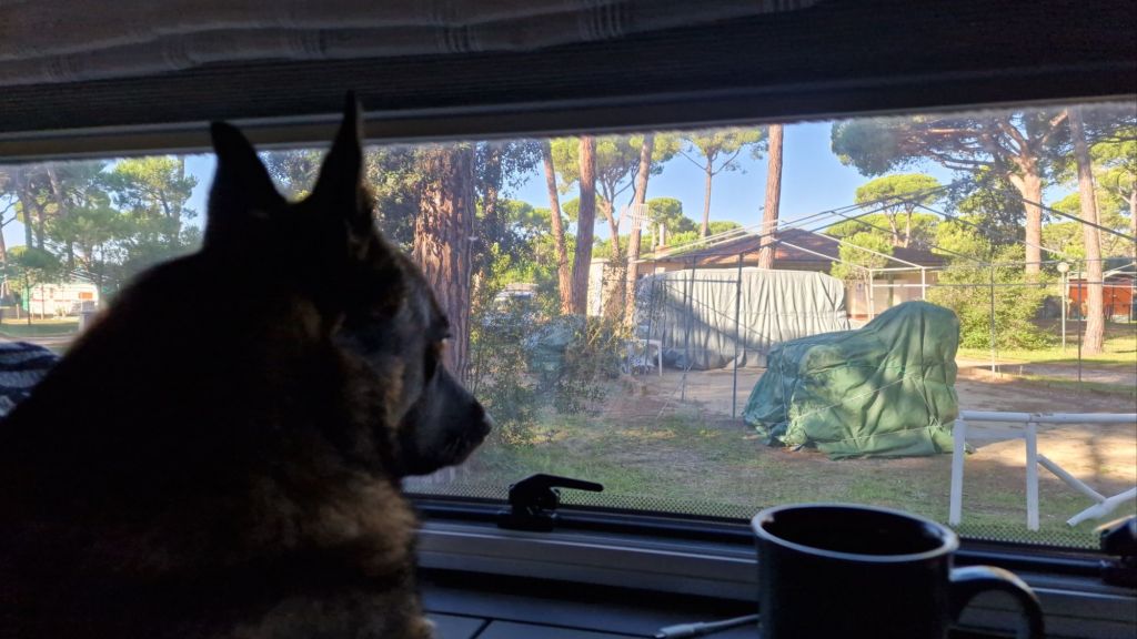 Morgonkaffet på Camping La PrincipinaDe här soptunnorna, för organiskt material, var upplåsta av campingen. Det var blått för kartong, gult för metall och plast (ja, de är i samma tunna). Svart för oåtervinnbart, dvs skräpetsskräp som blir kvar när resten är sorterat. Men det fanns ”överallt” stängda tunnor, som man antagligen behövde kort med chip e dyl för att låsa upp. Soporna ligger längs med vägarna istället. DrakflygningRadarn är påkoppladSittkvarbjörnÖronen rätt vinklade mot solen.LjungPå plats under bordet.På alerten under bordet. Butia yatay Yucca gloriosa, även känd som spansk dolk. Den pryder flertalet av de platser vi besökt när vi kom ner till italienska västkusten.Högväxt ljung, Björn och jag ser ut som lilleputtar bakom den pampiga växten.Solnedgång