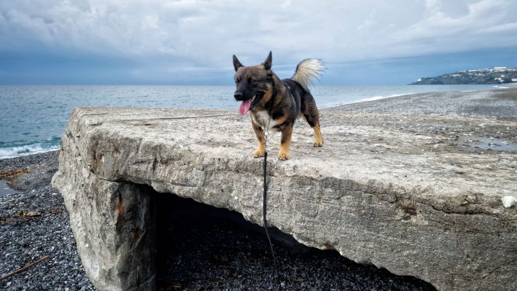 Ställplatsen vi är på har en egen vaktschäfer. Så här smyger inte någon in, från vägen, där han har sitt ”kontor”. Förutom i morse då jag och Björn smög förbi och schäfern hade fått ett stort märgben att gnaga på. Det kan han ju vara värd, husse fick väl vakta själv den stunden.
