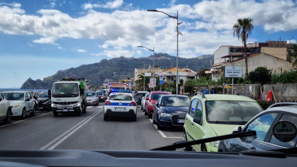 Det var delvis vägtullar, den principiellt enkla där man får en biljett vid infart och betalar vid utfart. Hur biljetterna erhålls är mystiskt. Idag var det ett tomt hål där man, enligt en symbol med en hand och pekande finger, skulle trycka. Bommen var öppen men stoppljuset var rött. Det fanns en röd knapp också, typ ”stopp” knapp. Vi tryckte på den, i brist på annat, och plötsligt hade vi en biljett och den röda lampan släcktes.