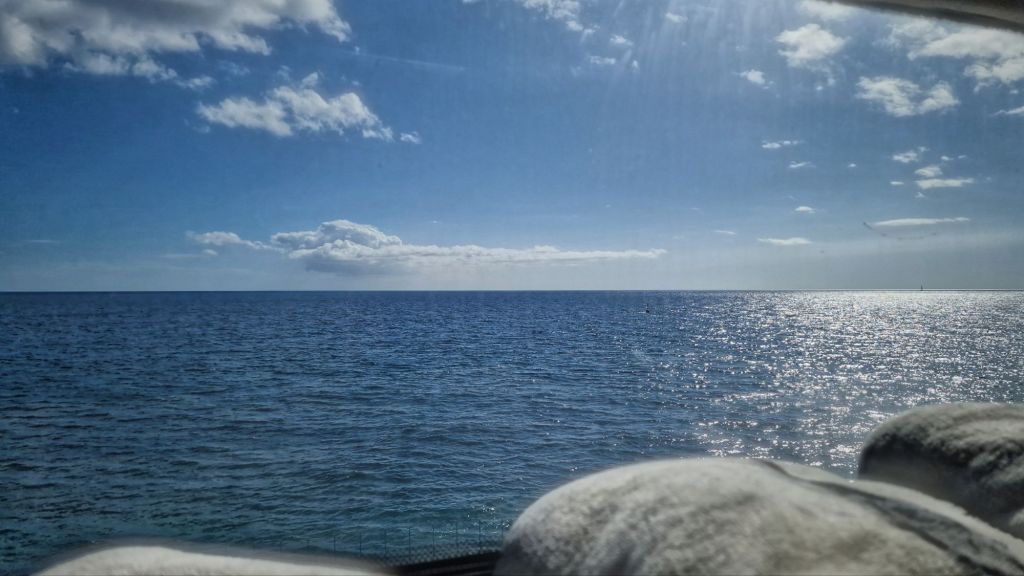 Kl 08.50 stod vi på plats i färjekön, i anvisad fil. Vi hade bokat till 11.20 och skulle vara på plats två timmar i förväg, så vi hann detta. Vi stod ganska långt fram, filerna var separerade med betongklossar. Så frågan var, hur sorterar de oss nu? Kanske inte alls, alla de som kommit senare än två timmar kan ju inte klaga. Vi väntade inte länge, kom på en färja direkt.