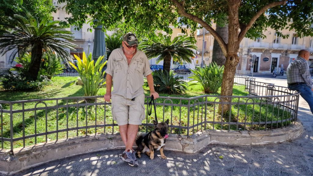 Morgonhängspaning. Matte dricker kaffe, ok. Husse har tillfälligt lämnat flocken. Oreda.Sådärja, ordningen snart återställd. Dags för ljudgivning.Svettigt väder.Pust i skuggan.Detta lilla kyrktorn, med klockor, var ett av alla dem som ringer runtom i staden då och då. Parasollet nedanför skyddade oss när vi lunchade på Trattoria Sicula. Man kunde beställa ”kött med sås” vilket jag valde och in kom diverse köttbitar, typ pulled pork och köttkorv, i generöst doserad tomatsås, gott. Konny tog pasta carbonara. Björn fick medhavt vatten och sporadiskt med godis.Fyrverkeri mysteriet klarnar. Denna firma erbjuder fyrverkeri till bröllop, alla andra tillfällen också, samt till restauranger.