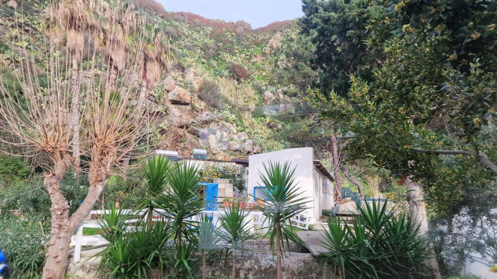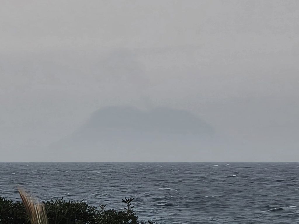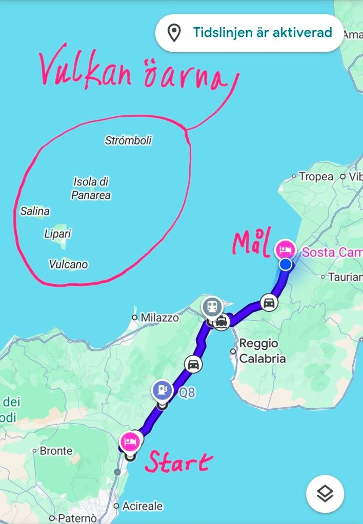 Från husbilen kikade vi genom ställplatsens entré, över vägen och bort mot Medelhavet. Ett litet berg sticker upp. Så där sitter vi och ser Stromboli från soffan!