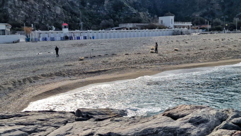Stranden behöver städas efter vinterns oväder. Killen till vänster sopar och han till höger silar sanden genom en håv/sil.
