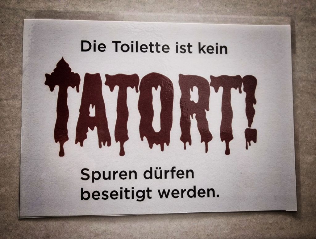 Toalettinstruktion på damernas. På svenska lär det betyda att ”toaletten är ingen brottsplats, man får städa bort spår” .