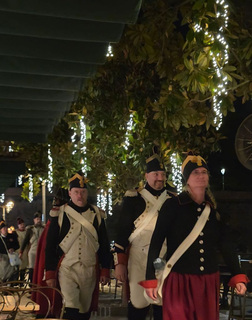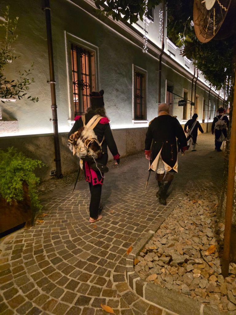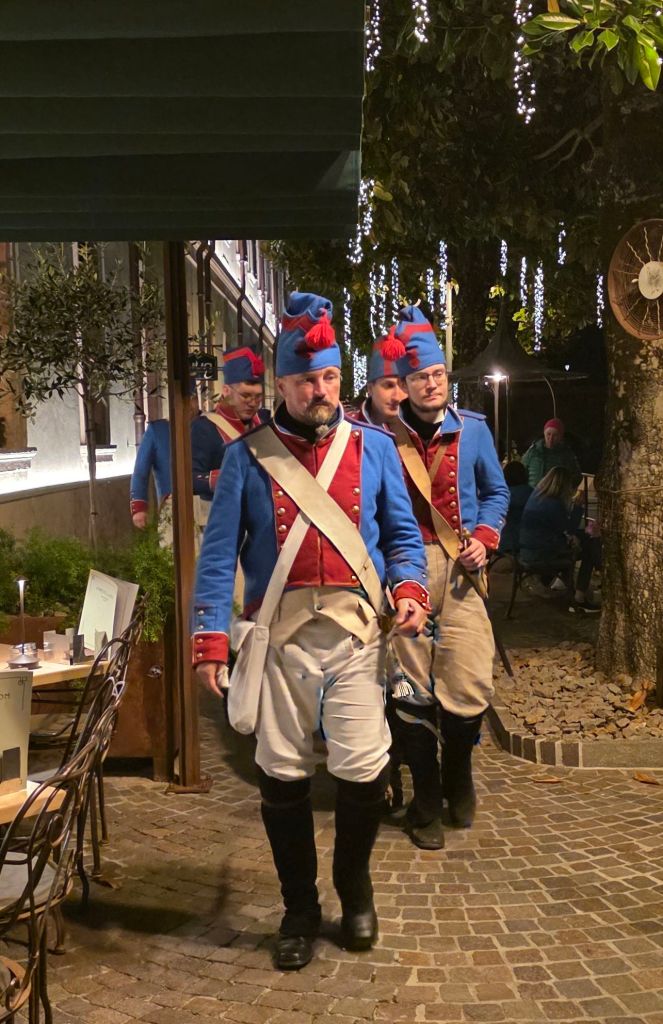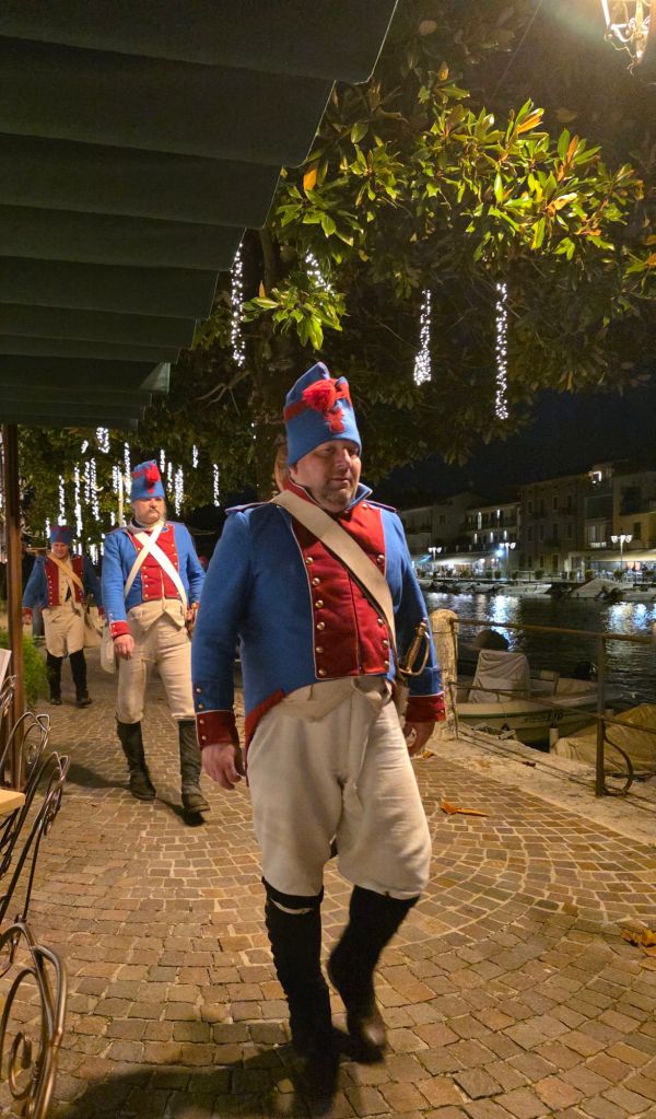 Färdbild Peschiera.En årlig festival till minne av ett slag vid floden Mincio,1814, där Fransmännen besegrade Österrikarna hölls fredag-söndag.Staden var full av tidsenligt klädda rollspelande soldater och annan i dåtida trupper ingående personal.Slaget vid Mincio Här är soldater på väg till sin kasern.