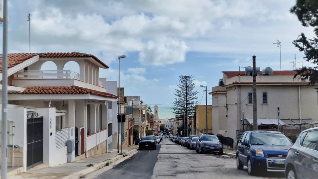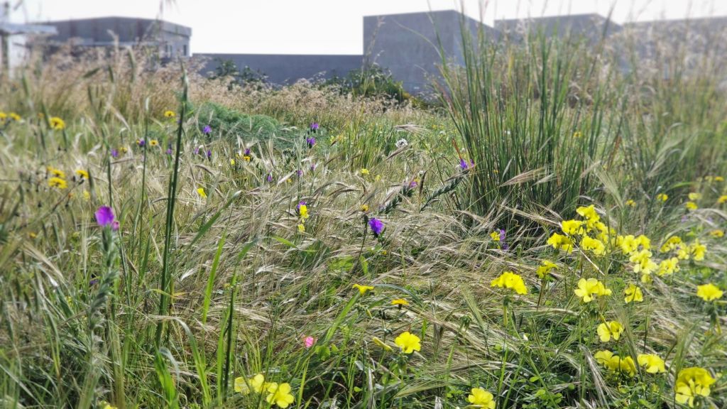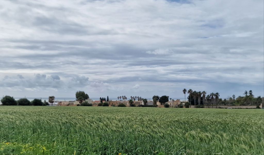 Kornet har kommit ganska långt. Byggnaderna mellan åkern och havet är en kyrkogård.
